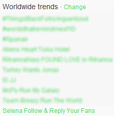 Hoje, 27, os fãs da Selena Gomez se uniram por um mesmo objetivo: fazer com que a cantora siga e responda ainda mais fãs no Twitter. Assim, deixaram a tag “Selena Follow & Reply Your Fans” – inicialmente criada por fãs brasileiros – entre os assuntos mais comentados da rede. Veja: ![]() Não deixe de segui-la (clicando aqui) para ter ainda mais chances de falar com ela. |