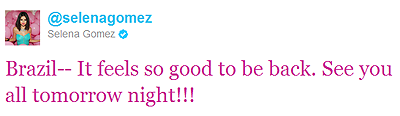 Selena Gomez já chegou no Brasil. Ela chegou na manhã de hoje (04) e está hospedada no Hotel “Sheraton” (endereço: Avenida Niemeyer 121 – Leblon · Rio De Janeiro). Selena também já notificou seus fãs sobre a chegada em seu twitter: “Brasil– É tão bom estar de volta. Vejo todos vocês amanhã à noite” ![]() Outros integrantes da banda também comentaram sobre a chegada ao Brasil. Dane Forrest: “Querido Brasil: NÓS ESTAMOS NO BRASIL” Greg Garman: “Finalmente no Brasil!!!” No momento (04/02 – 15:17) Selena já chegou no HSBC Arena onde fará o primeiro show no Brasil. Acompanhe tudo em tempo real pelo nosso twitter: @SGBRoficial ATUALIZADO – O @felipebcardoso nos enviou uma foto da fila da “Pista Premier” do show da Selena no HSBC ARENA, confira: CLIQUE AQUI. |